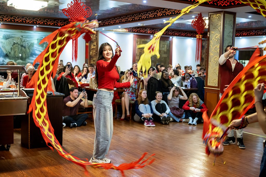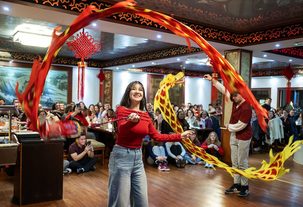 Guests attending International Week at IBA had the opportunity to try performing a dragon dance in front of the many attendees at the Lantern Festival.